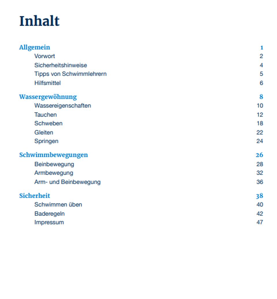 Die Broschüre enthält viele Erklärungen und illustrierte Übungen. Zusätzlich empfehlen wir die Teilnahme an einem Schwimmkurs zur Vertiefung der erlernten Kenntnisse.